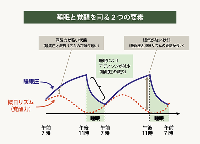当たり前ですが、私たちは、ずっと起きていることはできません。必ず、疲れて眠ります。眠くなる理由は、体の中で睡眠圧力が高まり、覚醒力が低下するからです。体や脳のエネルギーが使われると、脳内に、休息を促すための物質であるアデノシンが溜まります。起きている時間が長くなったり、心身の疲労が溜まったりするとアデノシンの濃度が高くなり、細胞活動を抑制させて眠気を生みます。